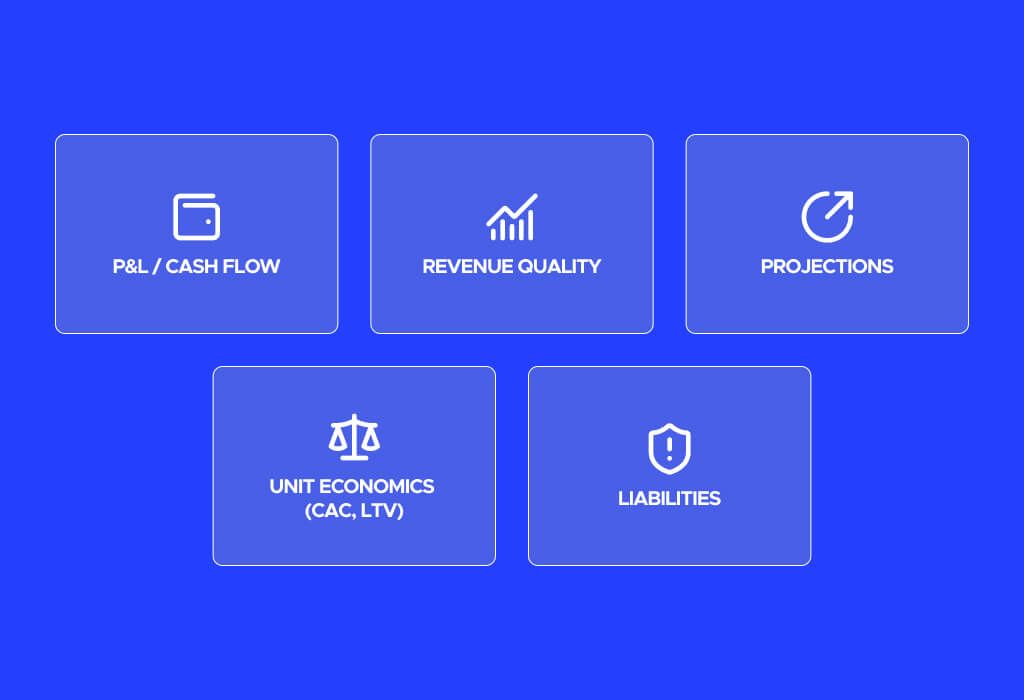 It should cover the main financial statements, revenue stability, cash burn, runway, debt, taxes, and core metrics like CAC, LTV, and payback period. Investors also review forecasts to see whether growth assumptions make sense.